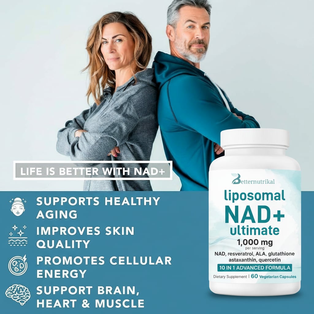 Most NAD+ supplements only provide a single ingredient, which limits their effect. BetterNutrikal Liposomal NAD+ Ultimate combines 10 clinically recognized nutrients that work together to boost energy, protect cells, and support healthy aging from multiple angles—not just one.